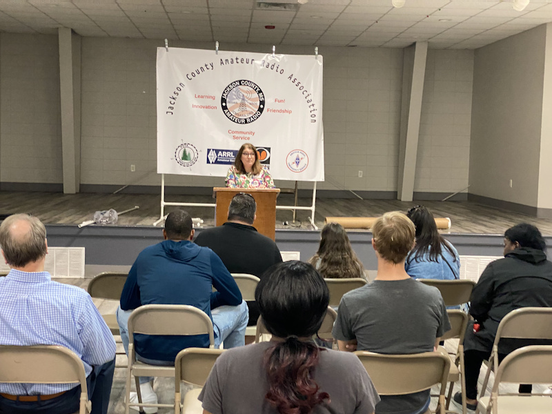 At the suggestion of Frank, K4FMH, the Jackson Amateur Radio Club applied for a $3,000 grant from the ARRL Foundation to purchase Ham Radio equipment to be used to establish a Ham Station at the Madison County Library. The grant was approved and the money was used to purchase an Icom IC-300 Transceiver and two Yaesu FTM-300D digital transceivers and related equipment. In the photo Margaret, K5MPM, Jim, AJ5K, Tamara Bates, KJ5KEX, Librarian and Clay, AC5Z check out the new equipment. (Photo provided by AK5J)